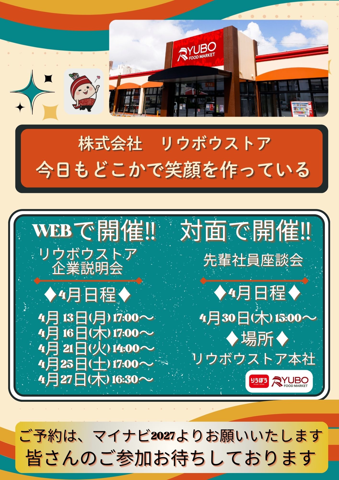 新卒採用募集情報 2025.03.01 ■マイナビからリウボウストアへエントリー受付締切 WEBご応募:4月27日(月)17:00まで 説明会も開催しておりますので たくさんのご参加お待ちしております! エントリーはこちらをクリック パンフレットはこちらをクリック