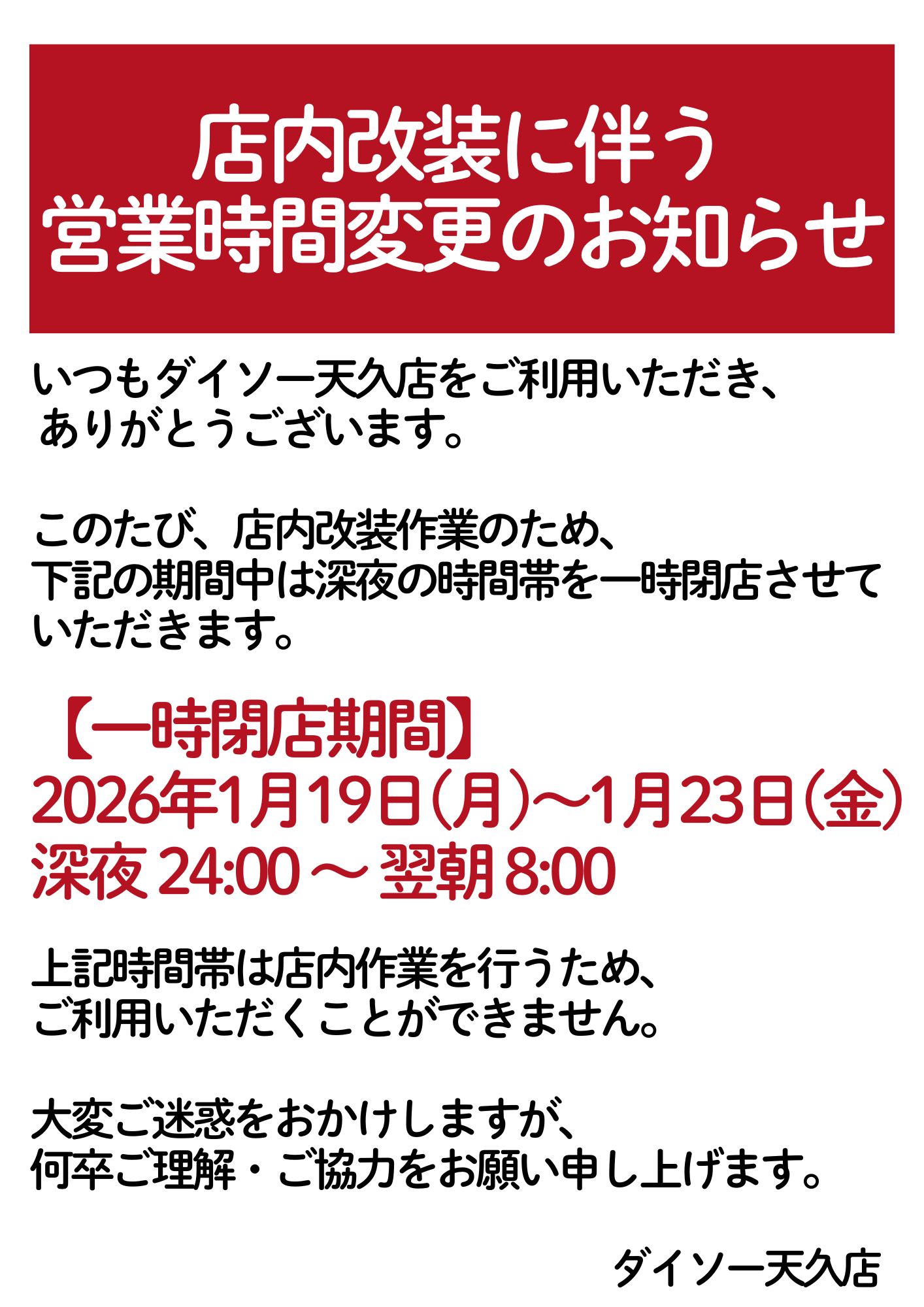 【ダイソー天久店】店内改装に伴う営業時間変更のお知らせ